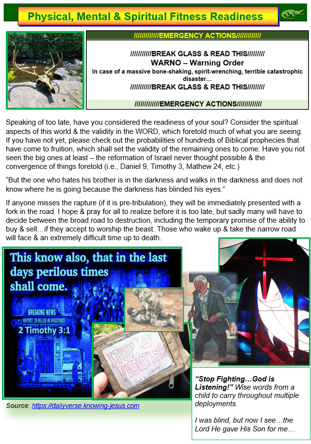CSAR – Christ’s Search & Rescue: Now we are on a different kind of mission. Once you become saved, it must be a primary objective to win souls for Christ daily. The proof of the Bible is in the fulfillment of the prophecies against mind-boggling odds. Wake up and smell the truth. Seek the salvation of the children of God and find souls for Him. If you miss the rapture and are now reading this trying to figure out what happened, and some affluent individual is telling you must take his mark to buy, sell, or die – this was foretold. DO NOT ACCEPT the Mark of the Beast.